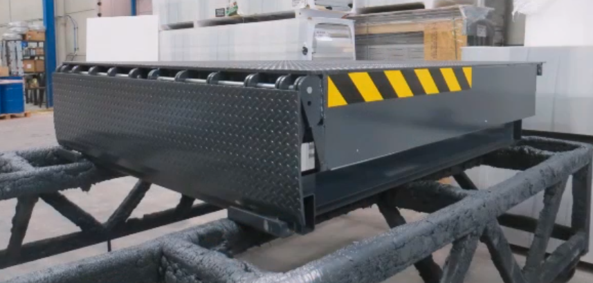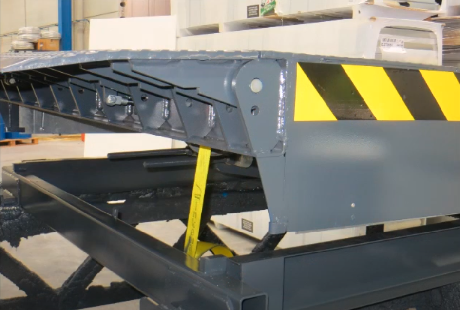 – Labio con bisagras autolimpiantes de chapa lagrimada de 13/15 mm de espesor. El labio de 400 mm. de proyección está plegado y fresado del extremo para ajustarse al camión y para suavizar el paso de montacargas y patines.